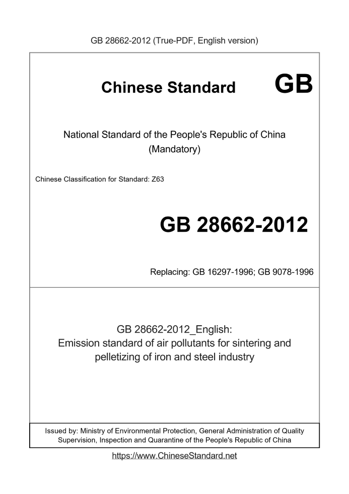 Basic dataStandard ID: GB 28662-2012 (GB28662-2012)Description (Translated English): Emission standard of air pollutants for sintering and pelletizing of iron and steel industry Sector / Industry: National Standard Classification of Chinese Standard: Z63 Classification of International Standard: 13.040.20 Word Count Estimation: 10,185 Older Standard (superseded by this standard): GB 16297-1996; GB 9078-1996 Quoted Standard: GB/T 15432-1995; GB/T 16157-1996; HJ/T 42-1999; HJ/T 43-1999; HJ/T 56-2000; HJ/T 57-2000; HJ/T 67-2001; HJ/T 77.2-2008; HJ 629-2011; HJ/T 397-2007; " automatic monitoring pollution management approach" SEPA Order No. 28; "Environmental monitoring and Mana Regulation (derived from): Department of Environmental Protection Notice No. 43 of 2012 National Standards Bulletin No. 24 of 2012 Issuing agency(ies): Ministry of Environmental Protection, General Administration of Quality Supervision, Inspection and Quarantine of the People's Republic of China Summary: This Chinese standard specifies the steel sinter and pellet production enterprises or production facilities air pollutant emission limits, monitoring, and monitoring requirements, and standards for the implementation and supervision of relevant regulation GB 28662-2012: Emission standard of air pollutants for sintering and pelletizing of iron and steel industry---This is a DRAFT version for illustration, not a final translation. Full copy of true-PDF in English version (including equations, symbols, images, flow-chart, tables, and figures etc.) will be manually/carefully translated upon your order. Emission standard of air pollutants for sintering and pelletizing of iron and steel industry ICS National Standards of People's Republic of China Iron and steel sintering, pellet industry air pollutant discharge standards Emission standard of air pollutants for sintering and pelletizing of iron and steel Industry Published on.2012-06-27 2012-10-01 Implementation Ministry of Environmental Protection State Administration of Quality Supervision, Inspection and Quarantine release ContentForeword..II 1 Scope 1 2 Normative references 1 3 Terms and Definitions..1 4 Air pollutant emission control requirements..2 5 Air pollutant monitoring requirements.4 6 Implementation and supervision..4ForewordIn order to implement the Environmental Protection Law of the People's Republic of China and the Law of the People's Republic of China on the Prevention and Control of Air Pollution, The Law of the People's Republic of China on Implementing the Scientific Outlook on Development and Strengthening Environmental Protection, and Other Laws and Regulations Opinions on Functional Area Planning, Protecting the Environment, Preventing Pollution, Promoting Steel Sintering and Pellet Industry Production Process and Pollution Control The advancement of technology, the development of this standard. This standard specifies the limits, monitoring and monitoring requirements for air pollutant emission from steel sintering and pellet production enterprises. For promotion Coordinated development of regional economy and environment, promote the adjustment of economic structure and the transformation of economic growth mode, and guide steel sintering and ball The development direction of the group production process and pollution control technology, this standard specifies the special emission limits for atmospheric pollutants. Steel sintering and pellet production enterprises emit water pollutants, odor pollutants and environmental noise for the corresponding national pollutants Emission standards, the identification, treatment and disposal of solid wastes are applicable to national solid waste pollution control standards. This standard is the first release. From the date of implementation of this standard, the regulations for the implementation of this standard for the control of atmospheric pollutant emissions from steel sintering and pellet production enterprises Ding, no longer implement the "Integrated Emission Standards for Air Pollutants" (GB 16297-1996) and "Industrial Kiln Air Pollutant Discharges" Relevant provisions in the Standards for Release (GB 9078-1996). Local provincial people's governments may formulate local pollutant discharge standards for pollutants not specified in this standard; The pollutants items that have been stipulated in this standard may be formulated with local pollutant discharge standards that are stricter than this standard. This standard was formulated by the Science and Technology Standards Department of the Ministry of Environmental Protection. This standard is mainly drafted by. Anshan Iron and Steel Group Design and Research Institute, Environmental Protection Institute of the Ministry of Environmental Protection. This standard was approved by the Ministry of Environmental Protection on June 15,.2012. This standard has been implemented since October 1,.2012. This standard is explained by the Ministry of Environmental Protection. Iron and steel sintering, pellet industry air pollutant discharge standards1 Scope of applicationThis standard specifies the limits, monitoring and monitoring of atmospheric pollutant emissions from steel sintering and pellet production enterprises or production facilities. Requirements, as well as standards for implementation and supervision. This standard applies to the management of atmospheric pollutants in existing steel sintering and pellet production enterprises or production facilities, as well as steel. Environmental impact assessment of iron sintering and pellet industry construction projects, design of environmental protection facilities, completion of environmental protection acceptance and investment Management of post-natal air pollutant emissions. This standard applies to the discharge of pollutants permitted by law. Site selection and special protection areas for newly established pollution sources The management of pollution sources shall be in accordance with the Law of the