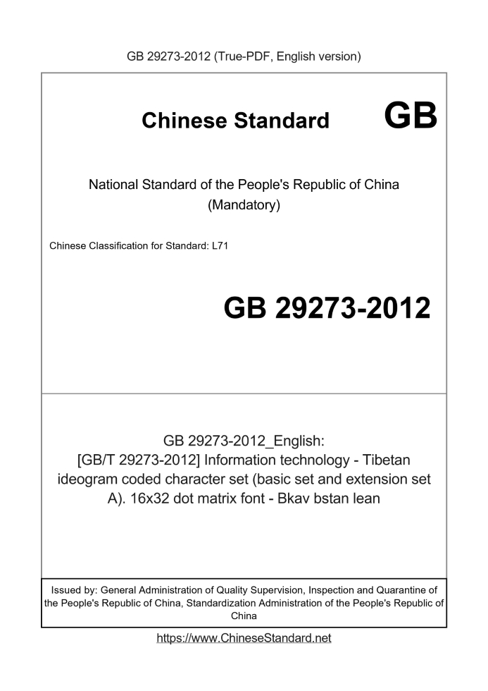 GB 29273-2012: [GB/T 29273-2012] Information technology - Tibetan ideogram coded character set (basic set and extension set A). 16x32 dot matrix font - Bkav bstan lean