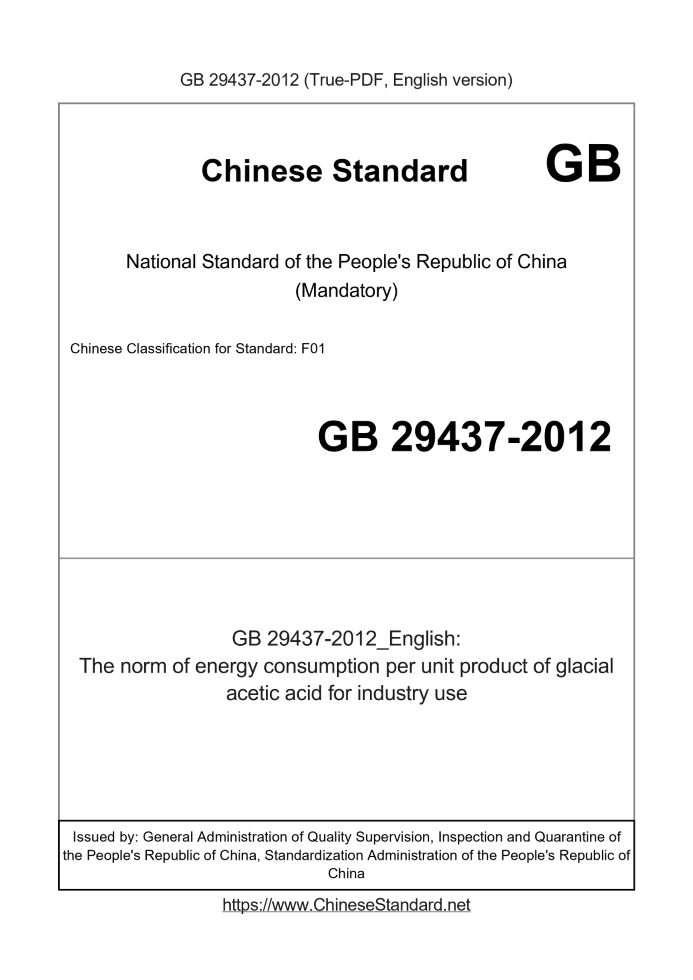 Delivery: <= 3 days. True-PDF full-copy in English will be manually translated and delivered via email. GB 29437-2012: The norm of energy consumption per unit product of glacial acetic acid for industry use Status: Valid