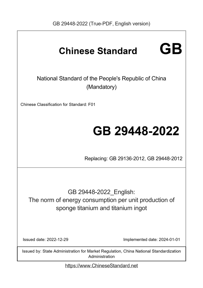 Delivery: <= 3 days. True-PDF full-copy in English will be manually translated and delivered via email. GB 29448-2022: The norm of energy consumption per unit production of sponge titanium and titanium ingot Status: Valid GB 29448: Historical versions