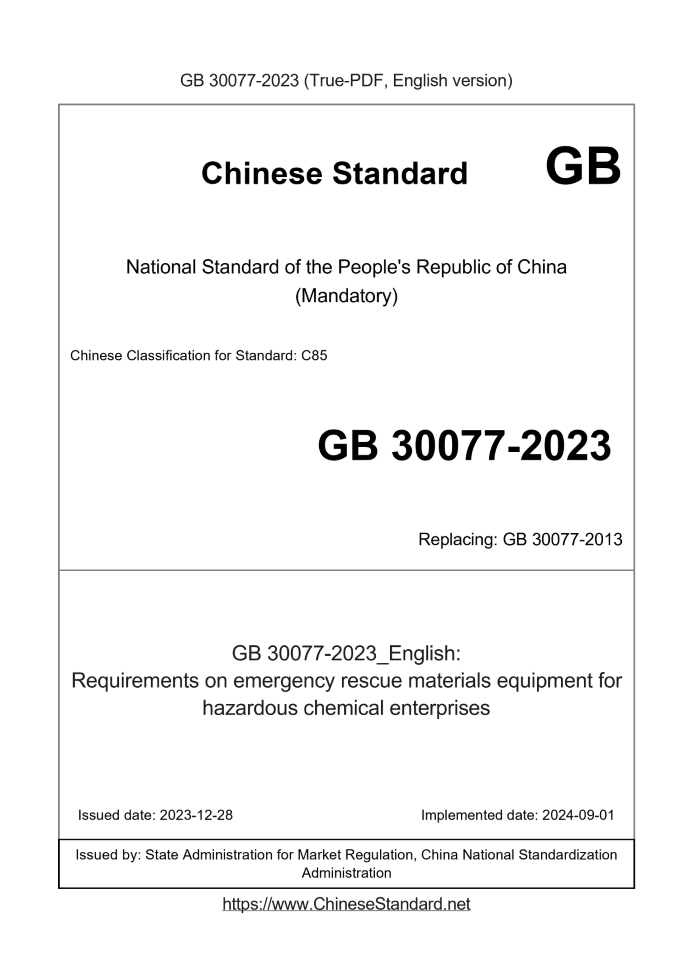 Delivery: <= 4 days. True-PDF full-copy in English will be manually translated and delivered via email. GB 30077-2023: Requirements on emergency rescue materials equipment for hazardous chemical enterprises Status: Valid GB 30077: Historical versions