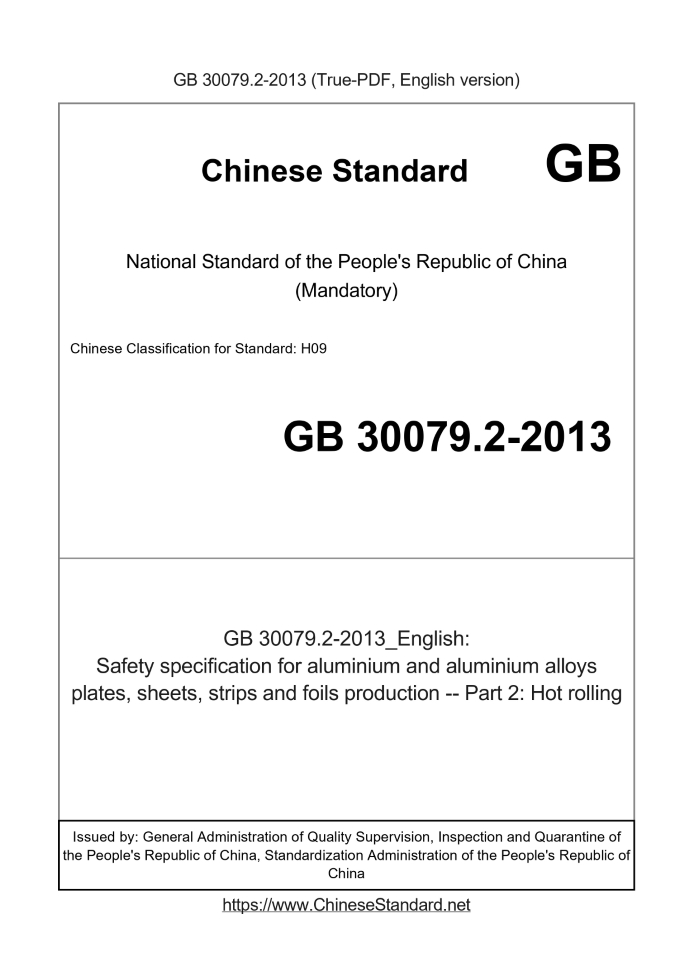 Delivery: <= 3 days. True-PDF full-copy in English will be manually translated and delivered via email. GB 30079.2-2013: Safety specification for aluminium and aluminium alloys plates, sheets, strips and foils production -- Part 2: Hot rolling Status: Valid