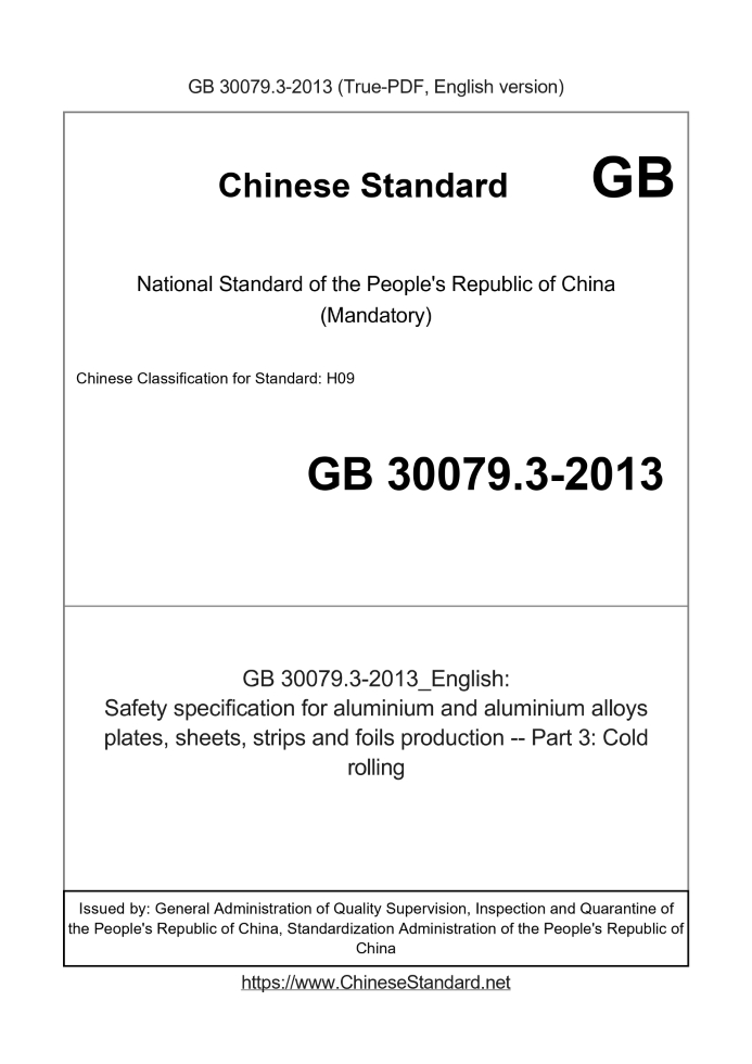 Delivery: <= 5 days. True-PDF full-copy in English will be manually translated and delivered via email. GB 30079.3-2013: Safety specification for aluminium and aluminium alloys plates, sheets, strips and foils production -- Part 3: Cold rolling Status: Valid