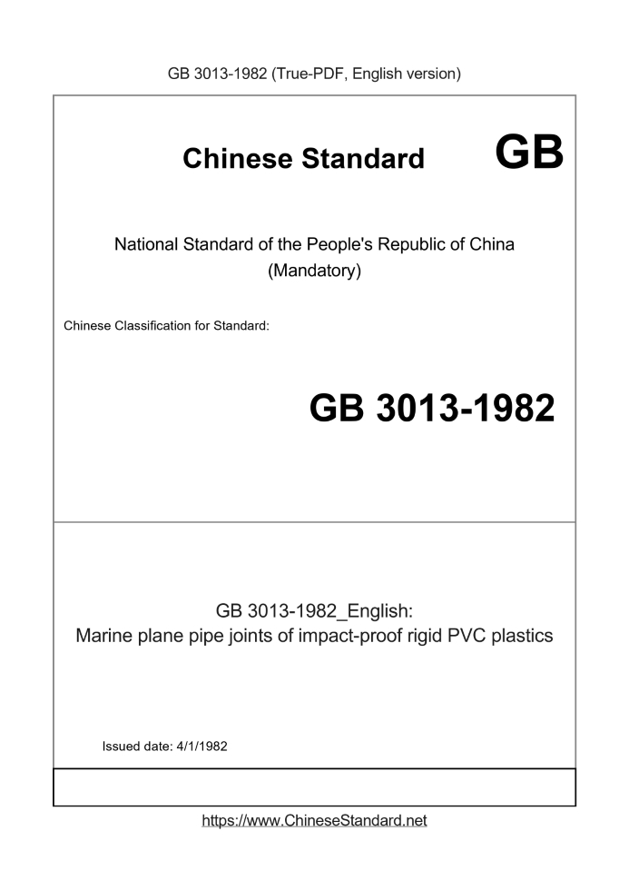 | GB 3013-1982 | English | RFQ | ASK | 3 days [Need to translate] | Marine plane pipe joints of impact-proof rigid PVC plastics |