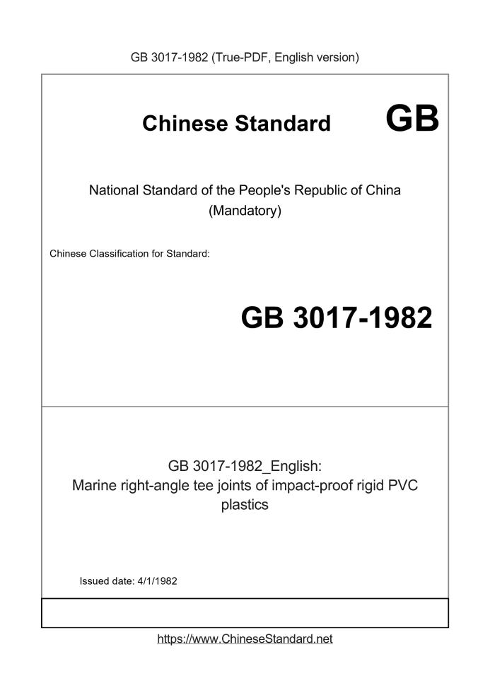 | GB 3017-1982 | English | RFQ | ASK | 3 days [Need to translate] | Marine right-angle tee joints of impact-proof rigid PVC plastics |