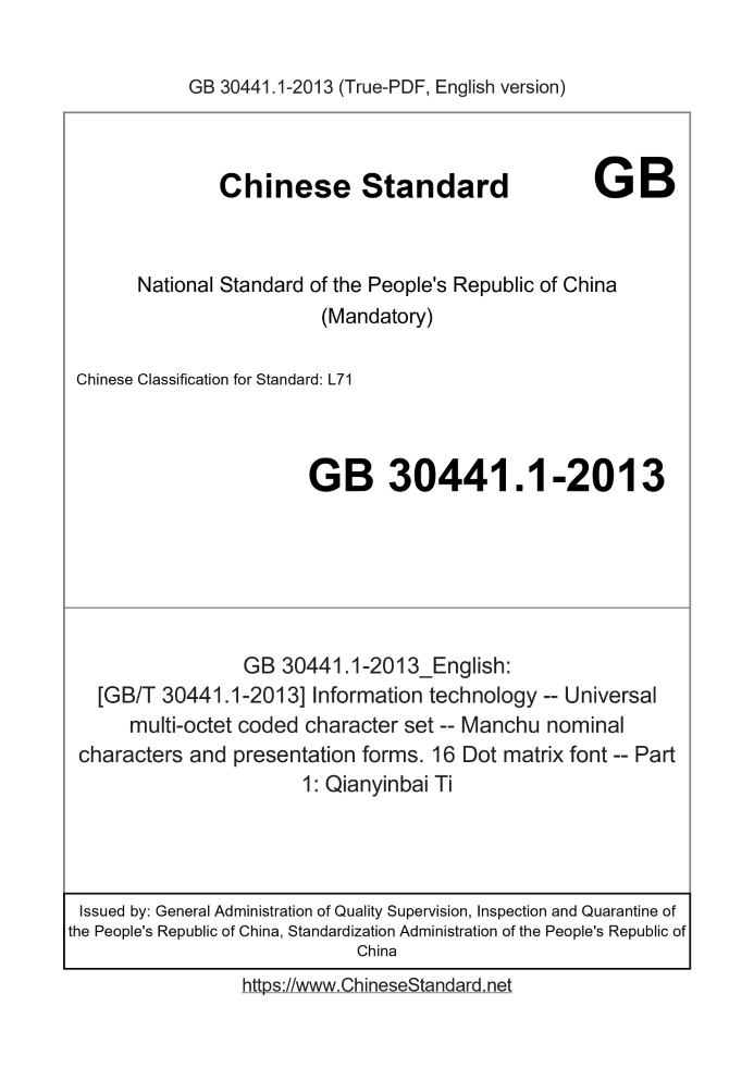 Delivery: <= 4 days. True-PDF full-copy in English will be manually translated and delivered via email. GB 30441.1-2013: [GB/T 30441.1-2013] Information technology -- Universal multi-octet coded character set -- Manchu nominal characters and presentation forms. 16 Dot matrix font -- Part 1: Qianyinbai Ti Status: Valid