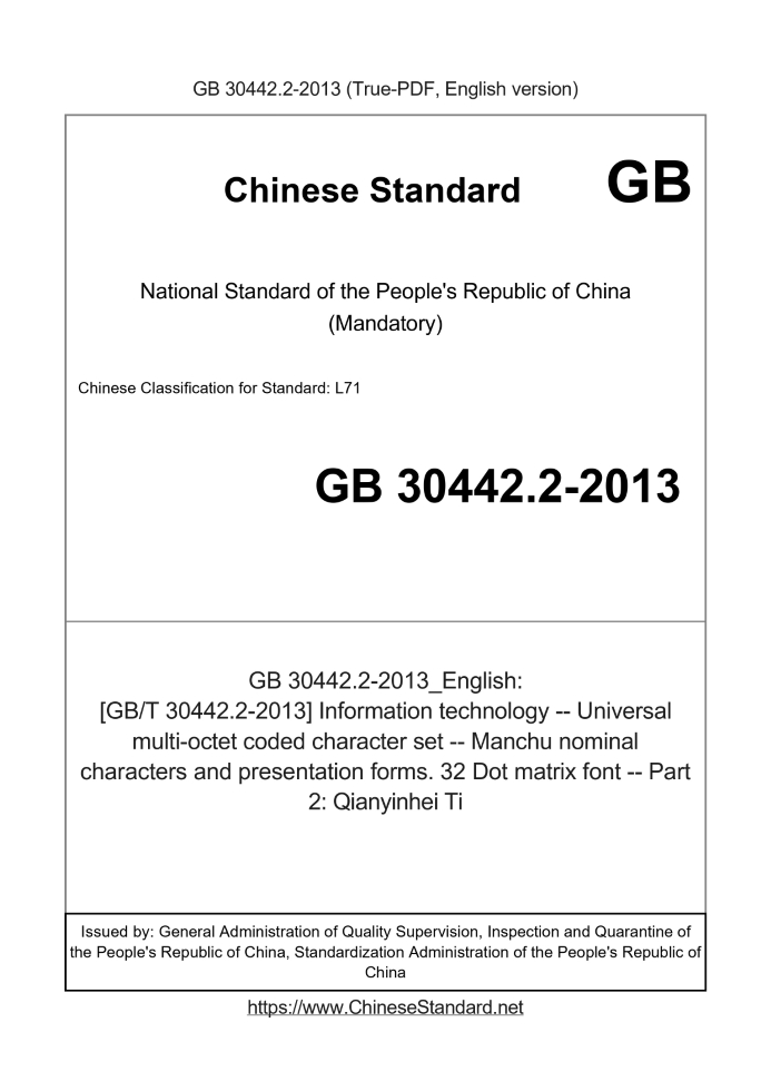 Delivery: <= 4 days. True-PDF full-copy in English will be manually translated and delivered via email. GB 30442.2-2013: [GB/T 30442.2-2013] Information technology -- Universal multi-octet coded character set -- Manchu nominal characters and presentation forms. 32 Dot matrix font -- Part 2: Qianyinhei Ti Status: Valid