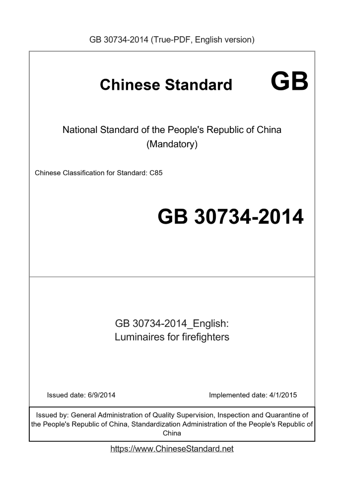 Delivery: <= 3 days. True-PDF full-copy in English will be manually translated and delivered via email. GB 30734-2014: Luminaires for firefighters Status: Valid