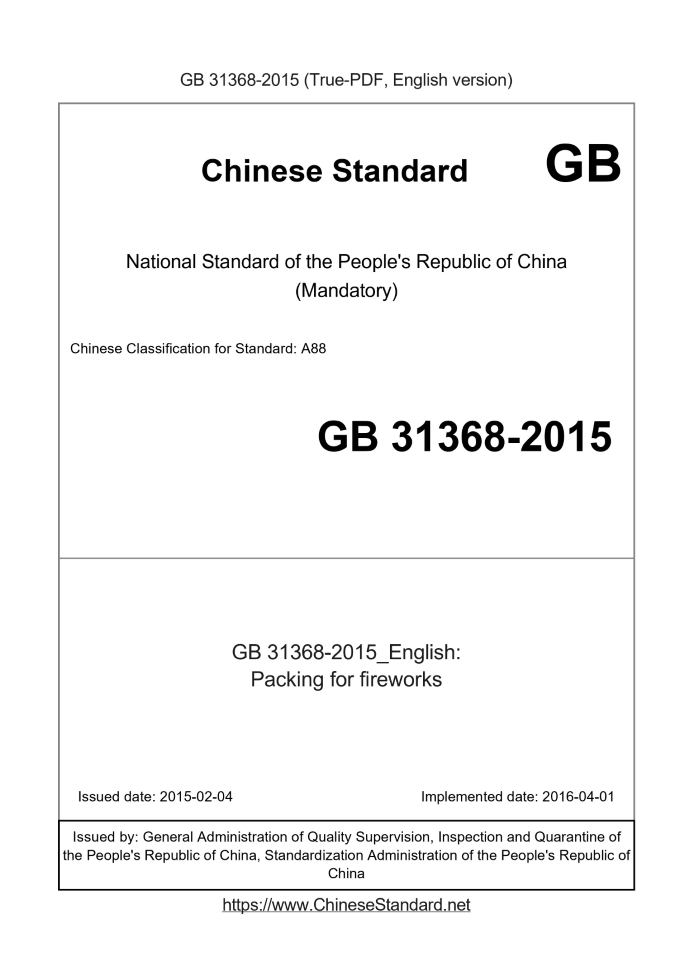 Delivery: <= 3 days. True-PDF full-copy in English will be manually translated and delivered via email. GB 31368-2015: Packing for fireworks Status: Valid