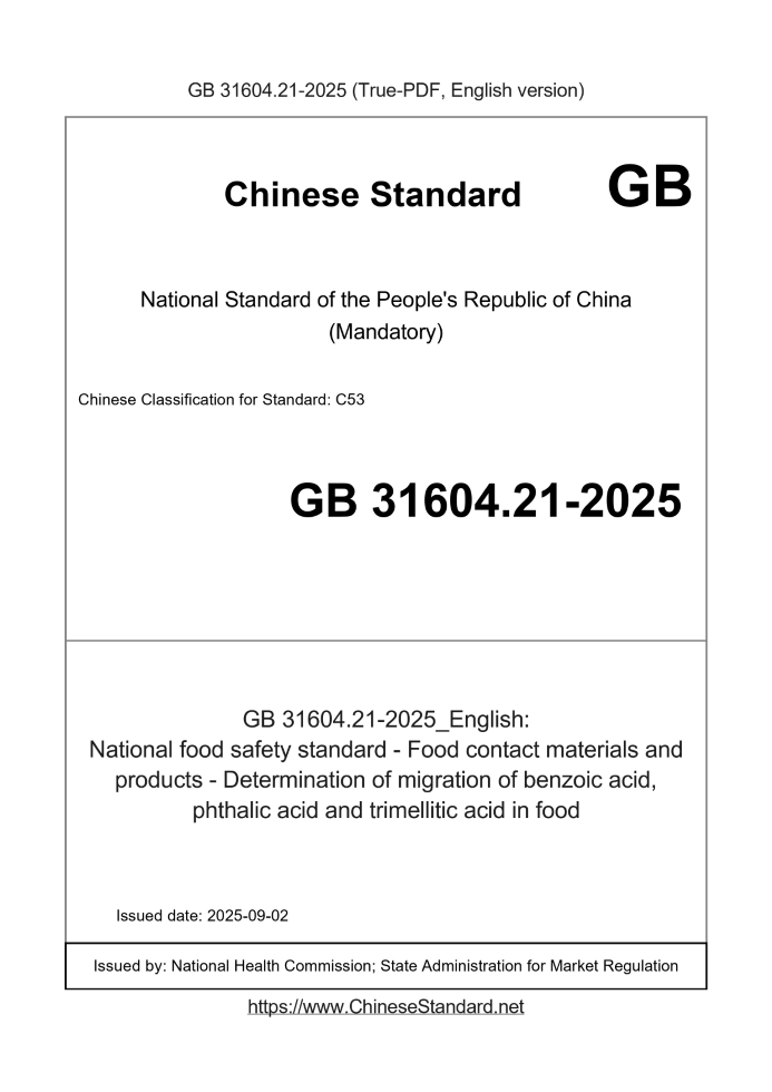 Delivery: <= 3 days. True-PDF full-copy in English will be manually translated and delivered via email. GB 31604.21-2025: National food safety standard - Food contact materials and products - Determination of migration of benzoic acid, phthalic acid and trimellitic acid in food Status: Valid GB 31604.21: Historical versions