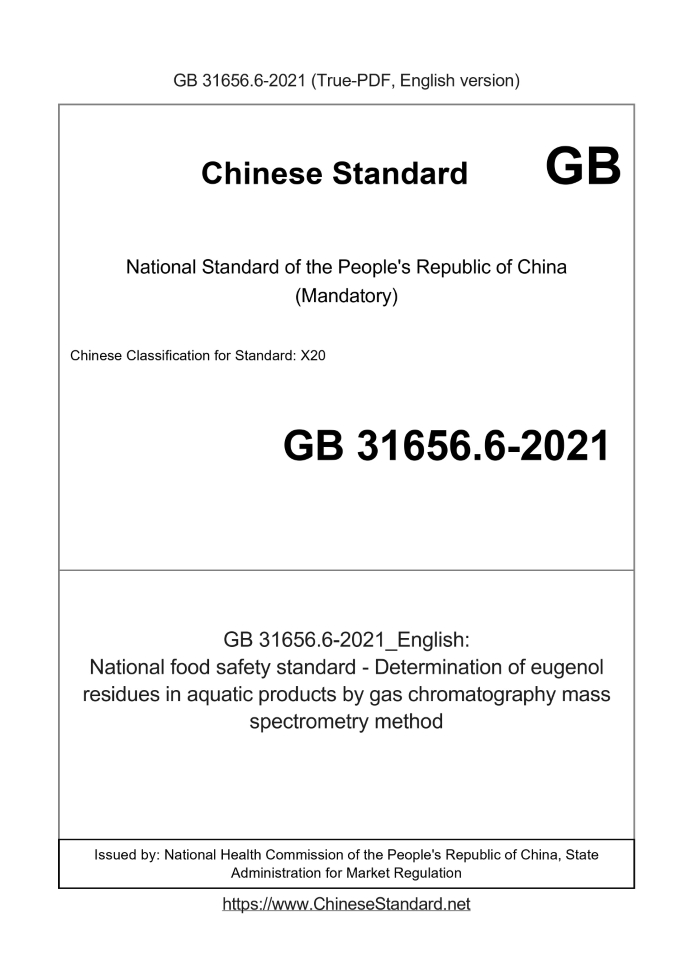 Delivery: <= 3 days. True-PDF full-copy in English will be manually translated and delivered via email. GB 31656.6-2021: National food safety standard - Determination of eugenol residues in aquatic products by gas chromatography mass spectrometry method Status: Valid