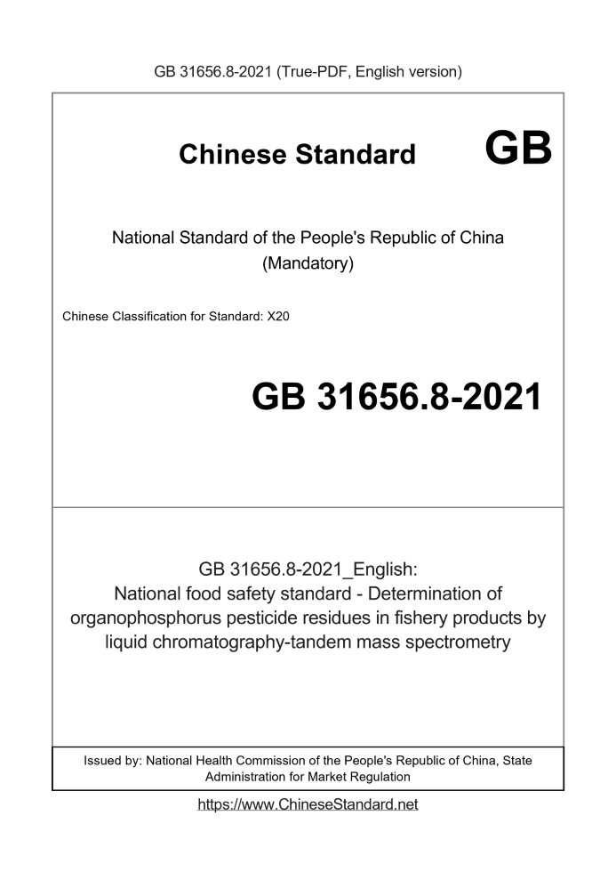 Delivery: <= 3 days. True-PDF full-copy in English will be manually translated and delivered via email. GB 31656.8-2021: National food safety standard - Determination of organophosphorus pesticide residues in fishery products by liquid chromatography-tandem mass spectrometry Status: Valid