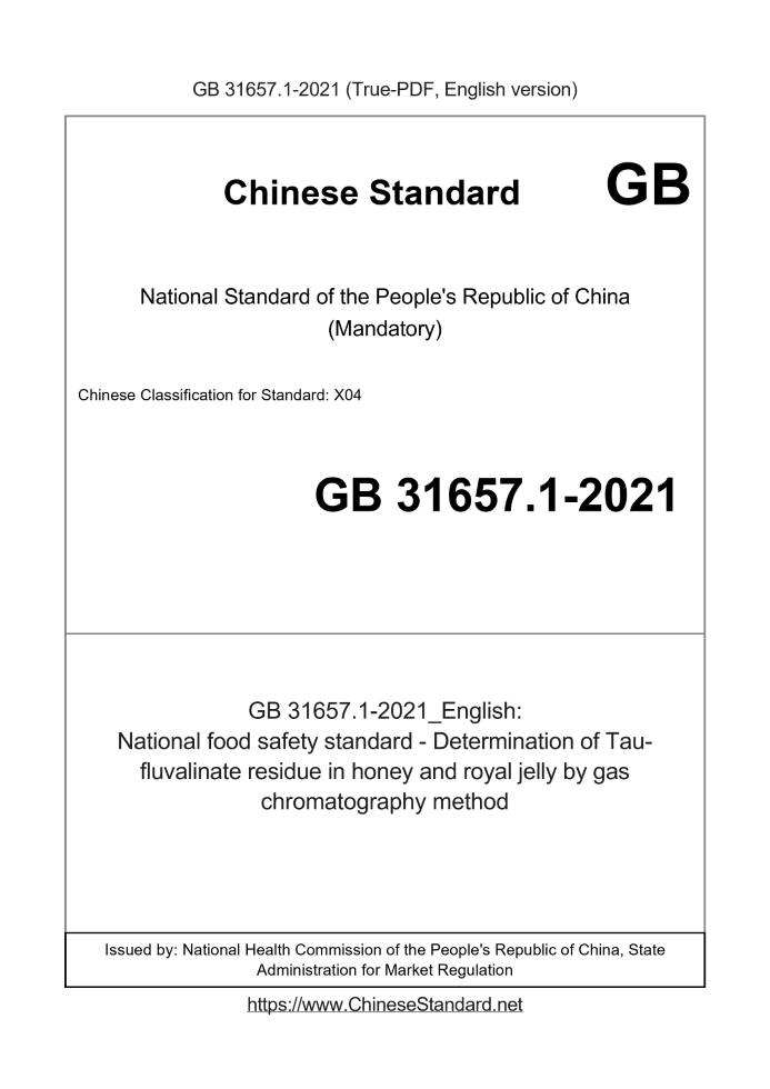 Delivery: <= 3 days. True-PDF full-copy in English will be manually translated and delivered via email. GB 31657.1-2021: National food safety standard - Determination of Tau-fluvalinate residue in honey and royal jelly by gas chromatography method Status: Valid