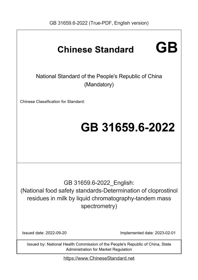 Delivery: <= 3 days. True-PDF full-copy in English will be manually translated and delivered via email. GB 31659.6-2022: (National food safety standards-Determination of cloprostinol residues in milk by liquid chromatography-tandem mass spectrometry) Status: Valid