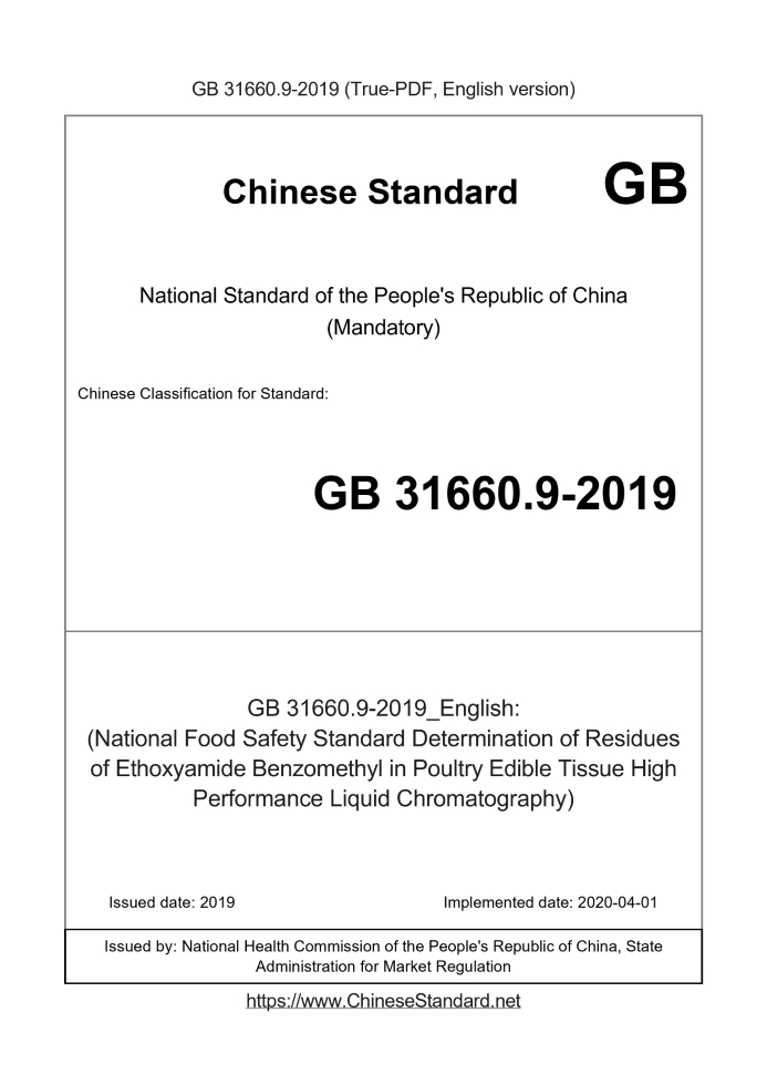 Delivery: <= 3 days. True-PDF full-copy in English will be manually translated and delivered via email. GB 31660.9-2019: (National Food Safety Standard Determination of Residues of Ethoxyamide Benzomethyl in Poultry Edible Tissue High Performance Liquid Chromatography) Status: Valid