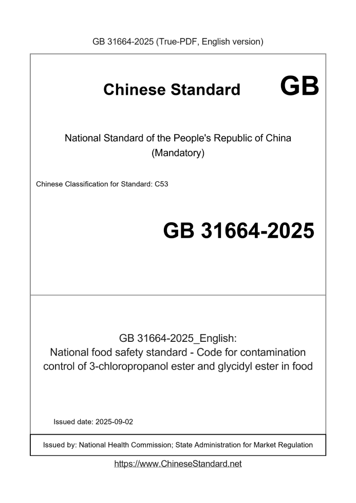 Delivery: <= 3 days. True-PDF full-copy in English will be manually translated and delivered via email. GB 31664-2025: National food safety standard - Code for contamination control of 3-chloropropanol ester and glycidyl ester in food Status: Valid