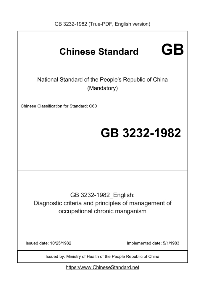 Delivery: <= 2 days. True-PDF full-copy in English will be manually translated and delivered via email. GB 3232-1982: Diagnostic criteria and principles of management of occupational chronic manganism Status: Obsolete