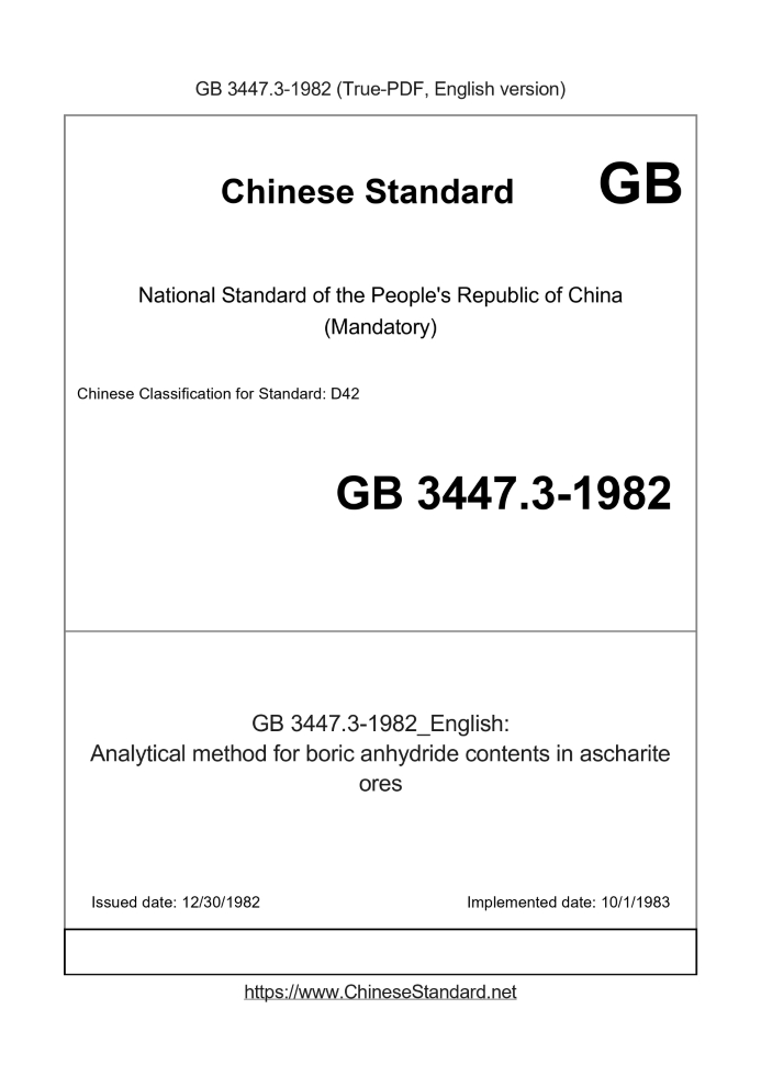 Delivery: <= 2 days. True-PDF full-copy in English will be manually translated and delivered via email. GB 3447.3-1982: Analytical method for boric anhydride contents in ascharite ores Status: Obsolete