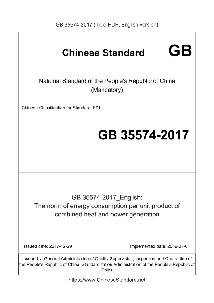 Delivery: <= 3 days. True-PDF full-copy in English will be manually translated and delivered via email. GB 35574-2017: The norm of energy consumption per unit product of combined heat and power generation Status: Valid