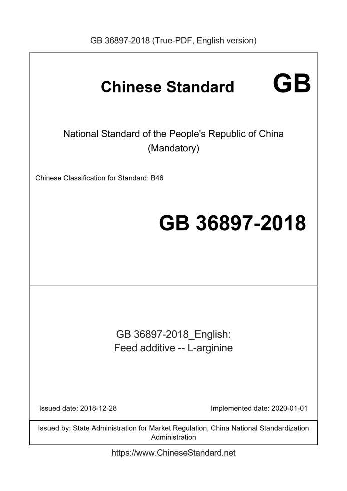 Feed additive--L--Arginine ICS 65.120 B46 National Standards of People's Republic of China Feed additive L-arginine Published on.2018-12-28 2020-01-01 implementation State market supervision and administration China National Standardization Administration issued