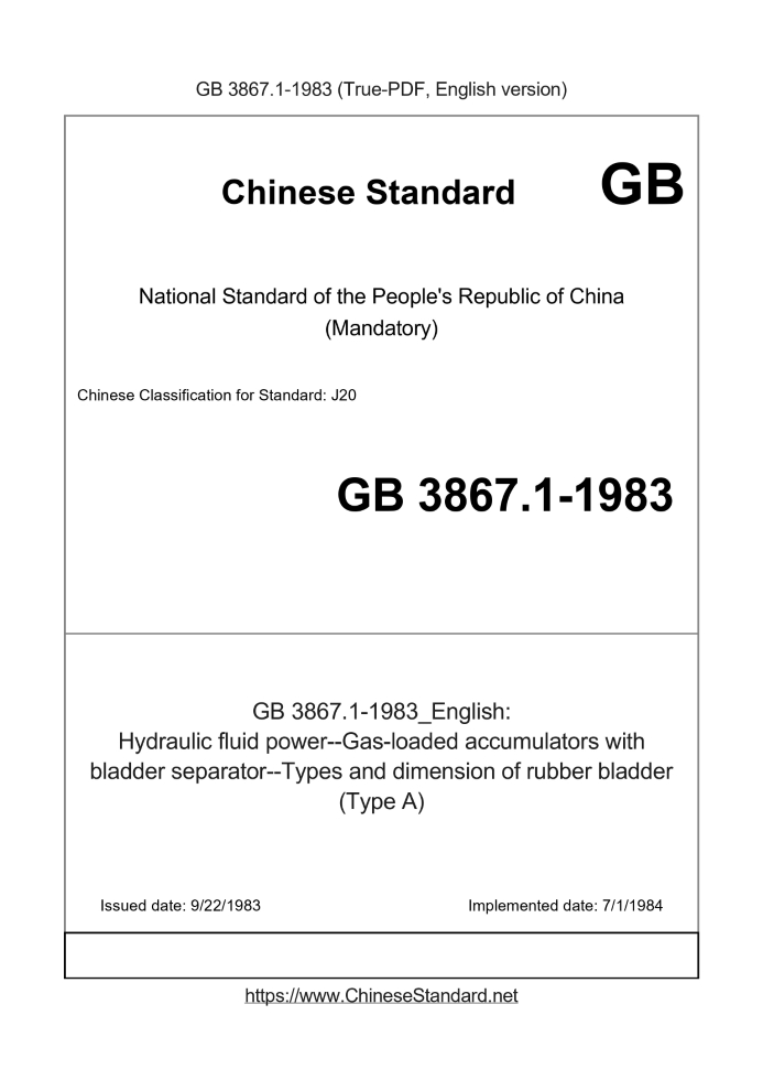 Delivery: <= 2 days. True-PDF full-copy in English will be manually translated and delivered via email. GB 3867.1-1983: Hydraulic fluid power--Gas-loaded accumulators with bladder separator--Types and dimension of rubber bladder (Type A) Status: Obsolete