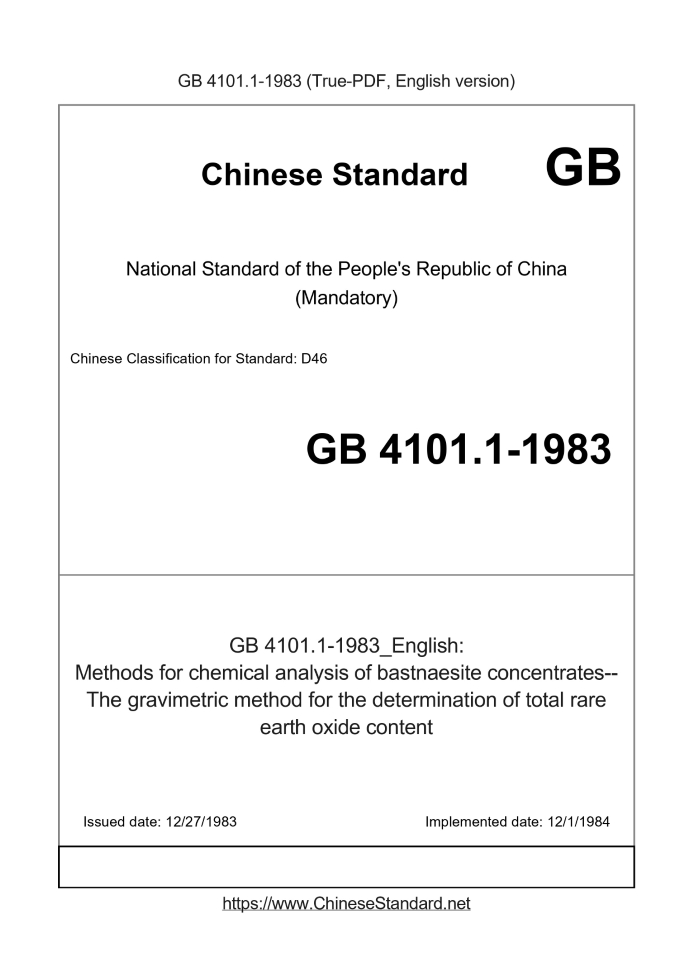 Delivery: <= 2 days. True-PDF full-copy in English will be manually translated and delivered via email. GB 4101.1-1983: Methods for chemical analysis of bastnaesite concentrates--The gravimetric method for the determination of total rare earth oxide content Status: Obsolete