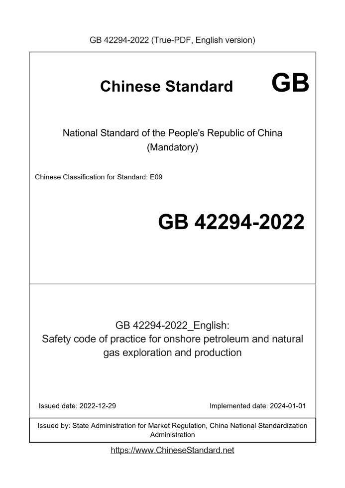 Delivery: <= 6 days. True-PDF full-copy in English will be manually translated and delivered via email. GB 42294-2022: Safety code of practice for onshore petroleum and natural gas exploration and production Status: Valid