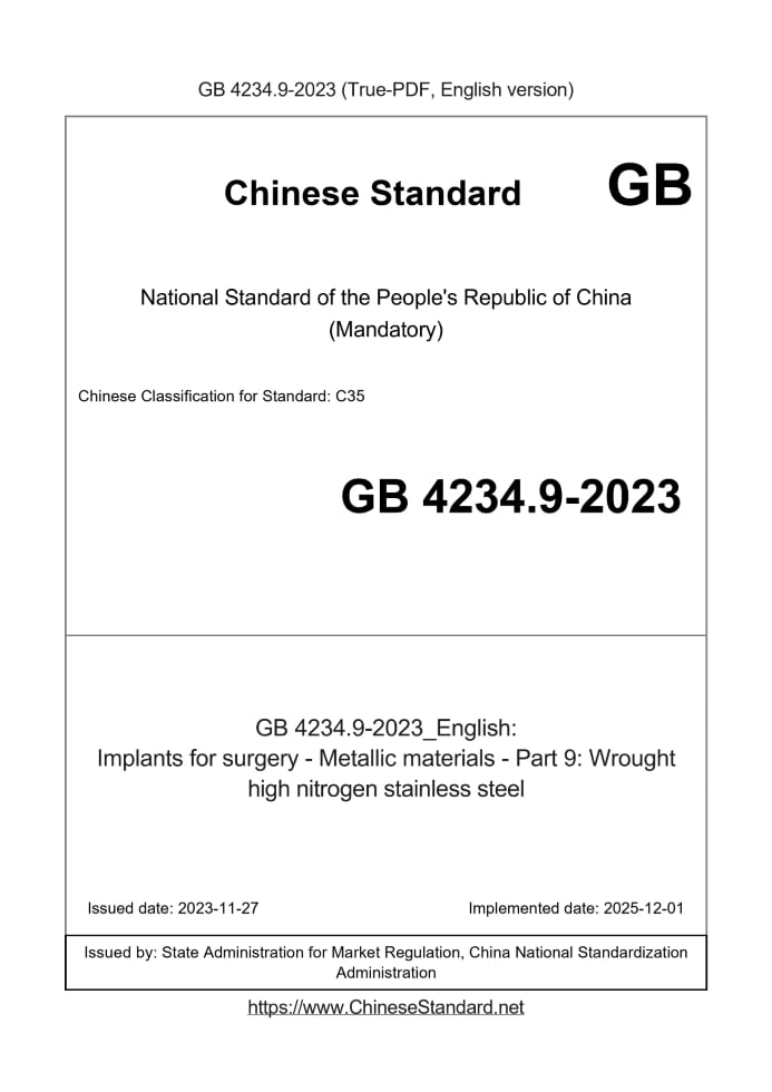 Delivery: <= 3 days. True-PDF full-copy in English will be manually translated and delivered via email. GB 4234.9-2023: Implants for surgery - Metallic materials - Part 9: Wrought high nitrogen stainless steel Status: Valid