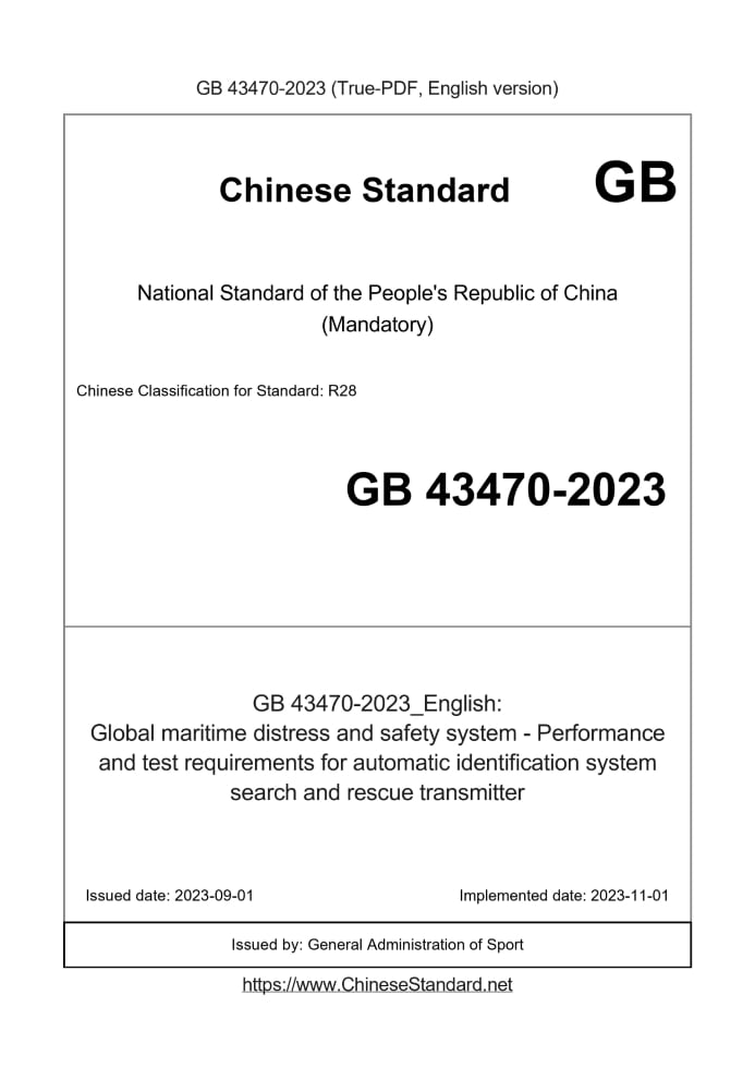 Delivery: <= 6 days. True-PDF full-copy in English will be manually translated and delivered via email. GB 43470-2023: Global maritime distress and safety system - Performance and test requirements for automatic identification system search and rescue transmitter Status: Valid