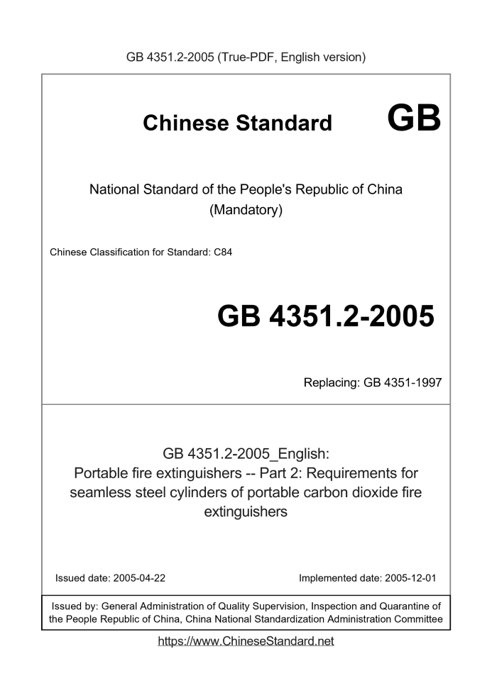 Delivery: <= 3 days. True-PDF full-copy in English will be manually translated and delivered via email. GB 4351.2-2005: Portable fire extinguishers -- Part 2: Requirements for seamless steel cylinders of portable carbon dioxide fire extinguishers Status: Obsolete