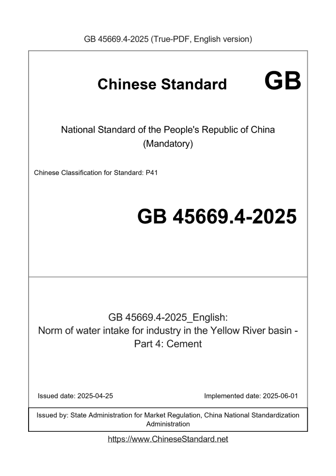 Delivery: <= 3 days. True-PDF full-copy in English will be manually translated and delivered via email. GB 45669.4-2025: Norm of water intake for industry in the Yellow River basin - Part 4: Cement Status: Valid