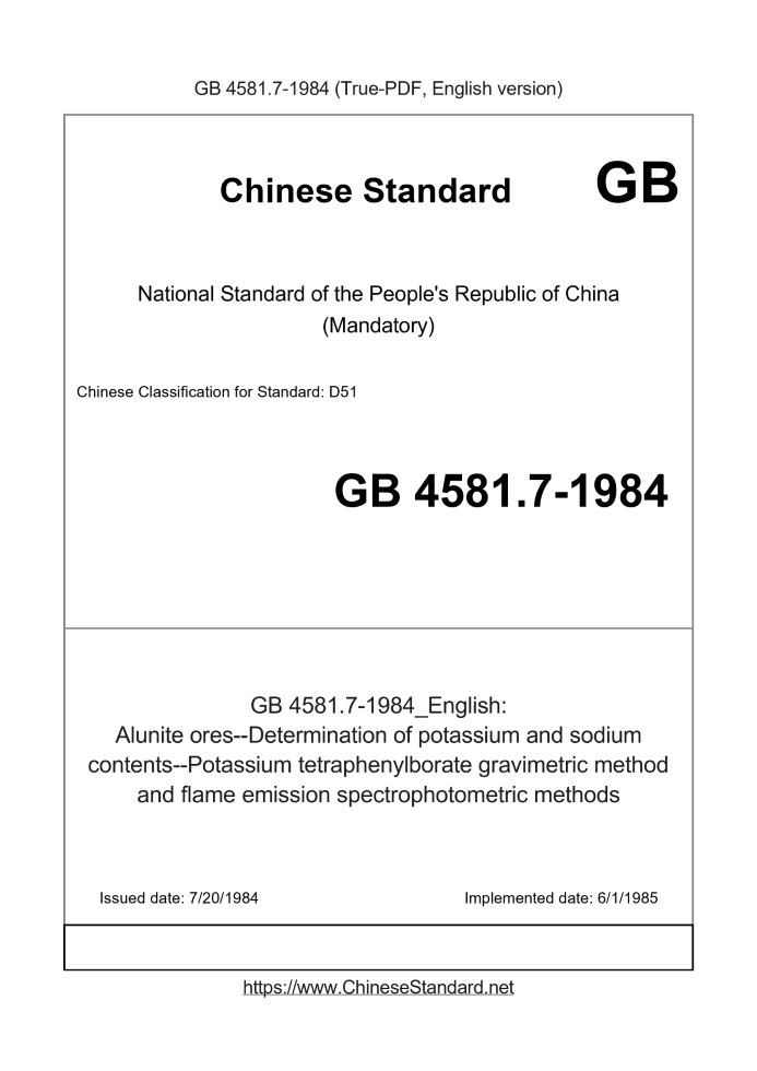 Delivery: <= 2 days. True-PDF full-copy in English will be manually translated and delivered via email. GB 4581.7-1984: Alunite ores--Determination of potassium and sodium contents--Potassium tetraphenylborate gravimetric method and flame emission spectrophotometric methods Status: Obsolete