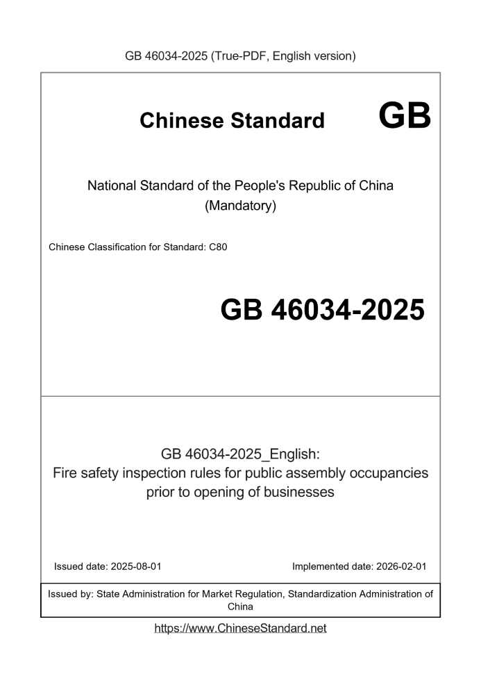 Delivery: <= 4 days. True-PDF full-copy in English will be manually translated and delivered via email. GB 46034-2025: Fire safety inspection rules for public assembly occupancies prior to opening of businesses Status: Valid