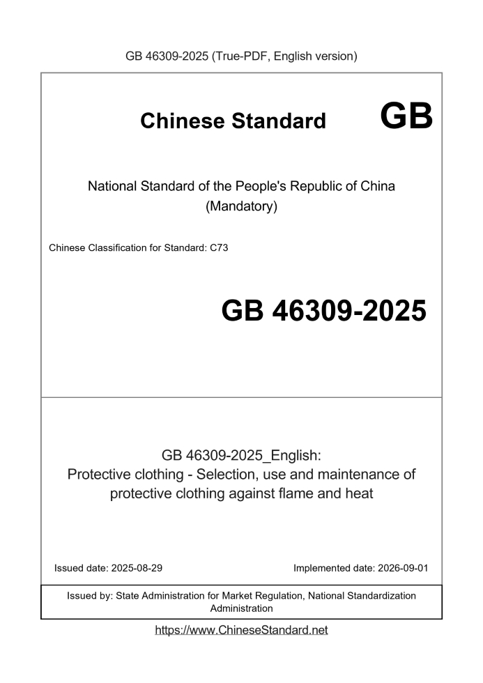 Delivery: <= 5 days. True-PDF full-copy in English will be manually translated and delivered via email. GB 46309-2025: Protective clothing - Selection, use and maintenance of protective clothing against flame and heat Status: Valid