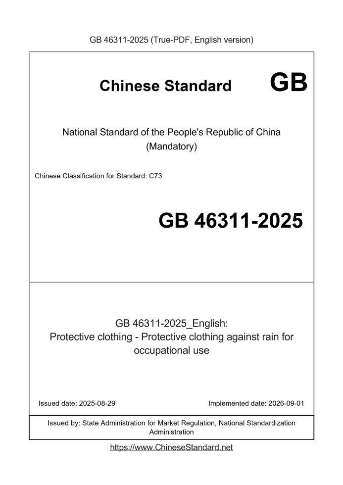 Delivery: <= 4 days. True-PDF full-copy in English will be manually translated and delivered via email. GB 46311-2025: Protective clothing - Protective clothing against rain for occupational use Status: Valid