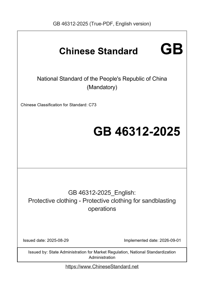 Delivery: <= 4 days. True-PDF full-copy in English will be manually translated and delivered via email. GB 46312-2025: Protective clothing - Protective clothing for sandblasting operations Status: Valid
