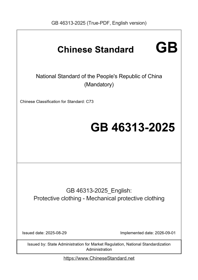 Delivery: <= 4 days. True-PDF full-copy in English will be manually translated and delivered via email. GB 46313-2025: Protective clothing - Mechanical protective clothing Status: Valid