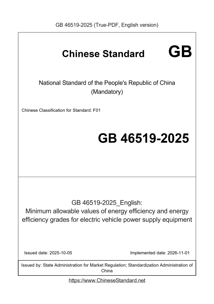 Delivery: <= 4 days. True-PDF full-copy in English will be manually translated and delivered via email. GB 46519-2025: Minimum allowable values of energy efficiency and energy efficiency grades for electric vehicle power supply equipment Status: Valid