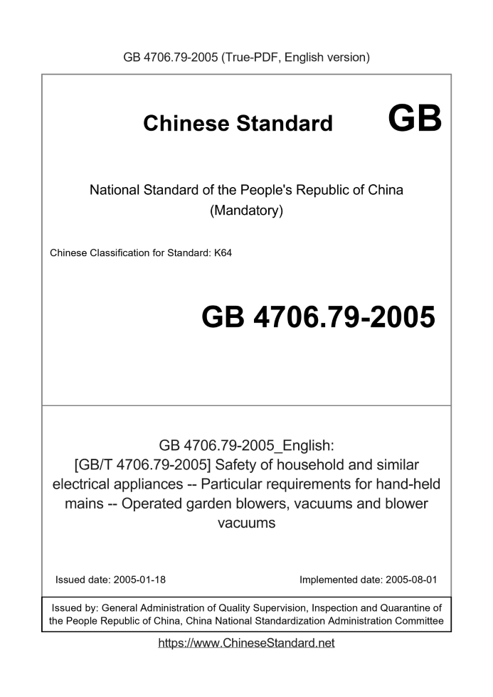 Delivery: <= 3 days. True-PDF full-copy in English will be manually translated and delivered via email. GB 4706.79-2005: [GB/T 4706.79-2005] Safety of household and similar electrical appliances -- Particular requirements for hand-held mains -- Operated garden blowers, vacuums and blower vacuums Status: Valid