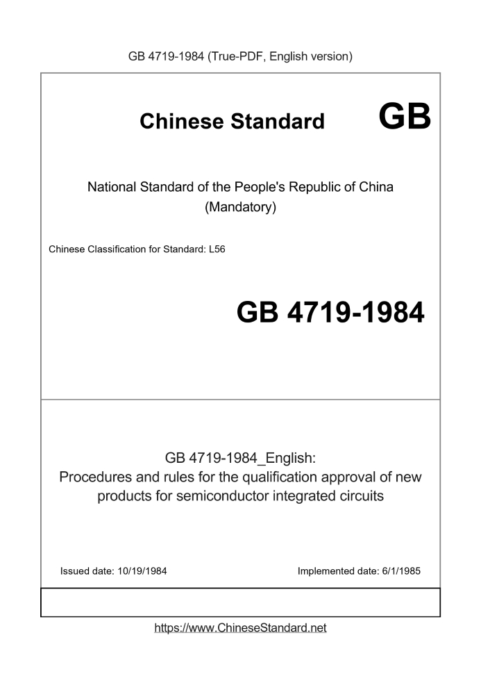 Delivery: <= 4 days. True-PDF full-copy in English will be manually translated and delivered via email. GB 4719-1984: Procedures and rules for the qualification approval of new products for semiconductor integrated circuits Status: Obsolete