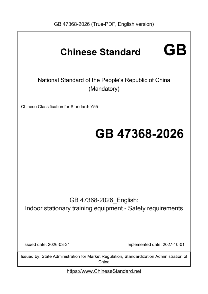 | GB 47368-2026 | English | RFQ | ASK | 3 days [Need to translate] | Indoor stationary training equipment - Safety requirements |