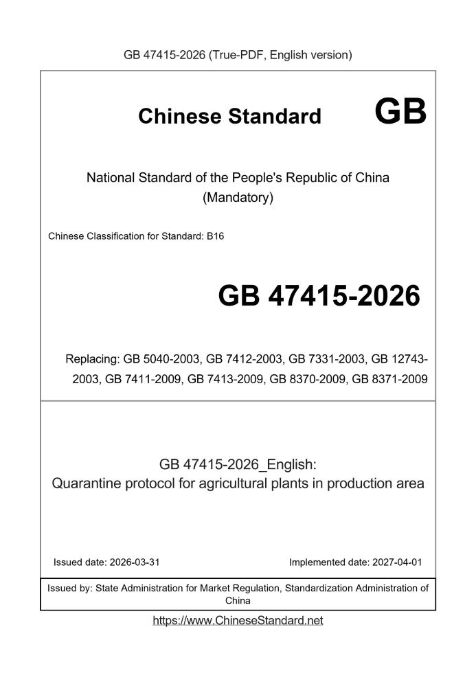 | GB 47415-2026 | English | RFQ | ASK | 3 days [Need to translate] | Quarantine protocol for agricultural plants in production area |
