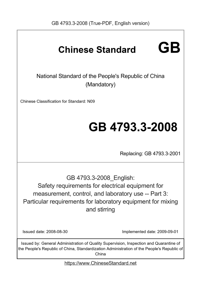 Delivery: <= 3 days. True-PDF full-copy in English will be manually translated and delivered via email. GB 4793.3-2008: Safety requirements for electrical equipment for measurement, control, and laboratory use -- Part 3: Particular requirements for laboratory equipment for mixing and stirring Status: Valid GB 4793.3: Historical versions