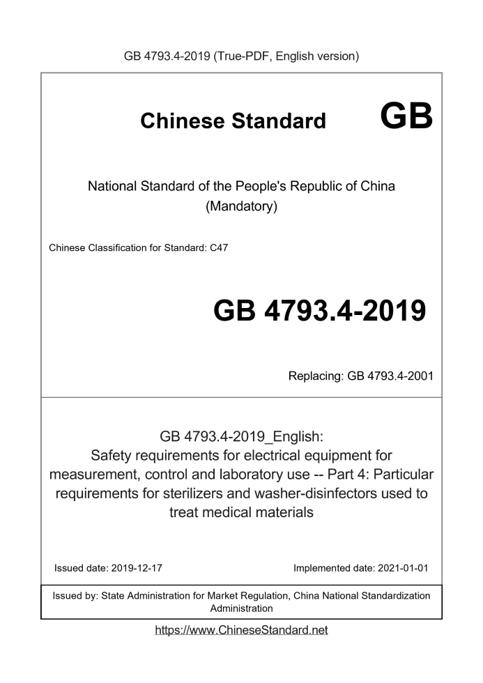 Delivery: <= 5 days. True-PDF full-copy in English will be manually translated and delivered via email. GB 4793.4-2019: Safety requirements for electrical equipment for measurement, control and laboratory use -- Part 4: Particular requirements for sterilizers and washer-disinfectors used to treat medical materials Status: Valid GB 4793.4: Historical versions