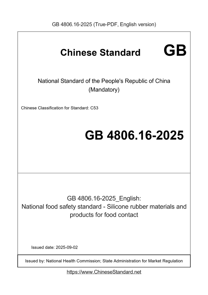 Delivery: <= 3 days. True-PDF full-copy in English will be manually translated and delivered via email. GB 4806.16-2025: National food safety standard - Silicone rubber materials and products for food contact Status: Valid