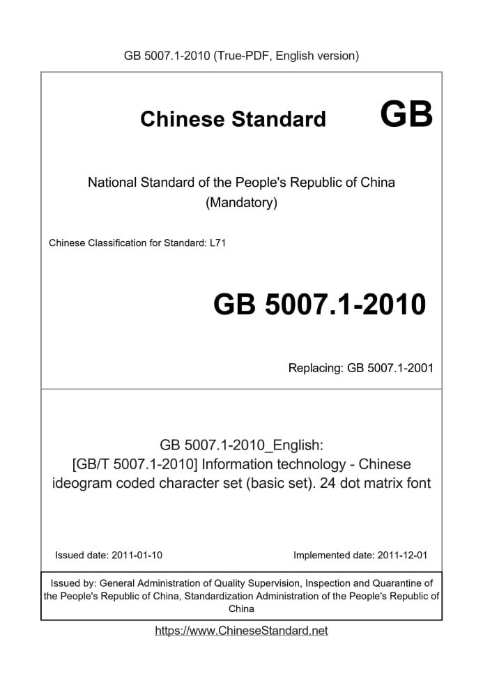 Delivery: <= 6 days. True-PDF full-copy in English will be manually translated and delivered via email. GB 5007.1-2010: [GB/T 5007.1-2010] Information technology - Chinese ideogram coded character set (basic set). 24 dot matrix font Status: Valid GB 5007.1: Historical versions