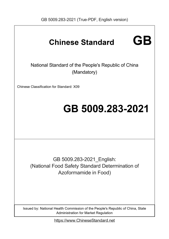 Delivery: <= 3 days. True-PDF full-copy in English will be manually translated and delivered via email. GB 5009.283-2021: (National Food Safety Standard Determination of Azoformamide in Food) Status: Valid
