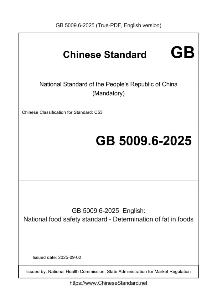 Basic dataStandard ID: GB 5009.6-2025 (GB5009.6-2025)Description (Translated English): National food safety standard - Determination of fat in foods Sector / Industry: National Standard Classification of Chinese Standard: C53 Word Count Estimation: 16,131 Date of Issue: 2025-09-02 Issuing agency(ies): National Health Commission; State Administration for Market Regulation GB 5009.6-2025: National food safety standard - Determination of fat in foods---This is an excerpt. Full copy of true-PDF in English version (including equations, symbols, images, flow-chart, tables, and figures etc.), auto-downloaded/delivered in 9 seconds, can be purchased online: https://www.ChineseStandard.net/PDF.aspx/GB5009.6-2025National Standards of the People's Republic of China National Food Safety Standards Determination of fat in food Published on 2025-09-02 Implemented on 2026-03-02 National Health Commission of the People's Republic of China State Administration for Market Regulation issued ForewordThis standard replaces GB 5009.6-2016 "National Food Safety Standard - Determination of Fat in Food". Compared with GB 5009.6-2016, the main changes in this standard are as follows. ---The applicability of the first method (Soxhlet extraction), the second method (acid hydrolysis), the third method (alkaline hydrolysis), and the fourth method (Geb process) has been modified. scope; ---Added sample preparation methods for the first method (Soxhlet extraction), the second method (acid hydrolysis), and the third method (alkali hydrolysis); ---Specifies the precision of oil samples in the first Soxhlet extraction method; ---The extraction solvent for the second acid hydrolysis method has been modified; ---Increased the volume fraction of sulfuric acid in the fourth Geb process. National Food Safety Standards Determination of fat in food 1.Scope This standard specifies the method for determining the fat content in food. The first method of this standard, Soxhlet extraction, is applicable to the determination of free fats in food. The second method of this standard, acid hydrolysis, is applicable to the determination of fat in food (excluding milk and dairy products). The third method of this standard, alkaline hydrolysis, is applicable to the determination of fat in milk and dairy products, special dietary foods, and protein beverages. The fourth method of this standard, the Geb method, is applicable to the determination of fat in raw milk, sterilized milk, and pasteurized milk. First method of Soxhlet extraction 2.Principle The sample was extracted directly with solvents such as anhydrous diethyl ether or petroleum ether, the solvent was evaporated to remove the solvent, and then dried to obtain the content of free fat. 3.Reagents and Materials Unless otherwise stated, all reagents used in this method are of analytical grade, and the water is grade III water as specified in GB/T 6682. 3.1 Reagents 3.1.1 Anhydrous diethyl ether (C4H10O). 3.1.2 Petroleum ether (CnH2n 2). The boiling range of petroleum ether is 30℃~60℃. 3.2 Materials 3.2.1 Quartz sand. 3.2.2 Absorbent cotton. 4.Instruments and Equipment 4.1 Homogenizer. 4.2 Tissue grinder or pulverizer. 4.3 Soxhlet extractor. 4.4 Constant temperature water bath. 4.5 Analytical balance. sensitivity of 0.001g and 0.0001g. 4.6 Electric heating forced-air drying oven. 4.7 Dryer. Contains an effective desiccant, such as silica gel. 4.8 Filter paper tube. 4.9 Evaporating dish. 5.Analysis Steps 5.1 Sample Preparation For particle-free and homogeneous liquid samples, shake well directly before use. For liquid samples with particles, non-homogeneous liquid samples, or semi-solid samples, use a homogenizer to mix them before use. For solid samples, use a tissue homogenizer or grinder to pulverize and mix thoroughly before use. For frozen drinks, heat appropriately to melt and stir thoroughly while hot. Mix thoroughly and set aside. The prepared sample should be tested as soon as possible. Note. Oil samples need to be dried at 105℃±2℃ for 1 hour, then crushed and passed through a sieve with a pore size of 0.425mm. 5.2 Sample Preparation 5.2.1 Solid sample. Weigh 2g to 5g of uniform sample (accurate to 0.001g) and transfer it all into the filter paper tube. 5.2.2 Liquid or semi-solid samples. Weigh 5g to 10g of a homogeneous sample (accurate to 0.001g), place it in an evaporating dish, and add approximately 20g of quartz. The sand was evaporated to dryness in a boiling water bath, dried in an electric hot air drying oven at 100℃±5℃ for 30 minutes, removed, ground into a fine powder, and then transferred entirely into a filter paper tube. The evaporating dish and the glass rod with the sample attached were wiped clean with degreased cotton soaked in ether, and the cotton was placed in the filter paper tube. 5.3 Extraction Place the filter paper tube into the extraction chamber of the Soxhlet extractor, connect it to a receiving flask that has been dried to constant weight (accurate to 0.0001 g), and extract from the extractor. Add anhydrous diethyl ether or petroleum ether to the upper end of the condenser until it reaches two-thirds of the bottle's volume. Heat the bottle in a water bath at 50°C to 60°C until the anhydrous diethyl ether... Alternatively, extract using petroleum ether with continuous reflux (6-8 times/hour), typically for 6-10 hours. At the end of extraction, collect 1 drop using a ground glass rod. Extraction is complete when no oil spots are found on the ground glass rod. 5.4 Weighing Remove the receiving bottle, recover anhydrous diethyl ether or petroleum ether, and when 1-2 mL of solvent remains in the receiving bottle, evaporate it to dryness in a 60°C water bath. Dry at 100℃±5℃ for 1 hour, then cool to room temperature in a desiccator and weigh (accurate to 0.0001g). Repeat the above steps until constant weight is achieved. (Until the difference between the two weighings does not exceed 2mg), take the result of the smallest weighing. 6.Pr