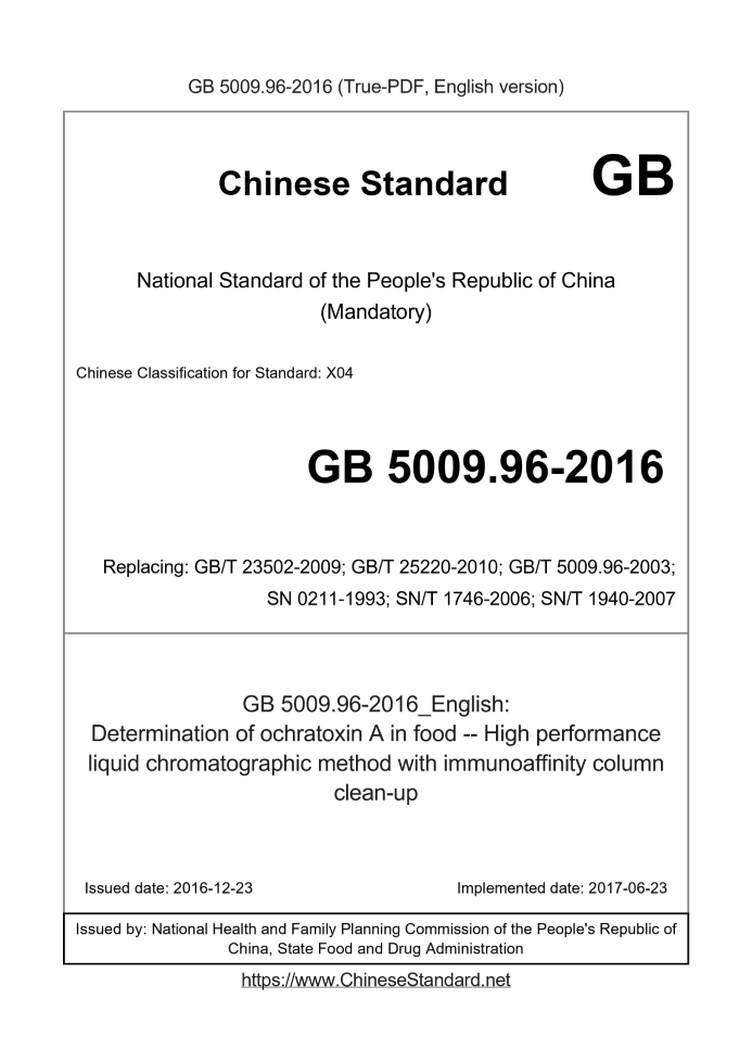 Delivery: <= 5 days. True-PDF full-copy in English will be manually translated and delivered via email. GB 5009.96-2016: Determination of ochratoxin A in food -- High performance liquid chromatographic method with immunoaffinity column clean-up Status: Valid GB 5009.96: Historical versions