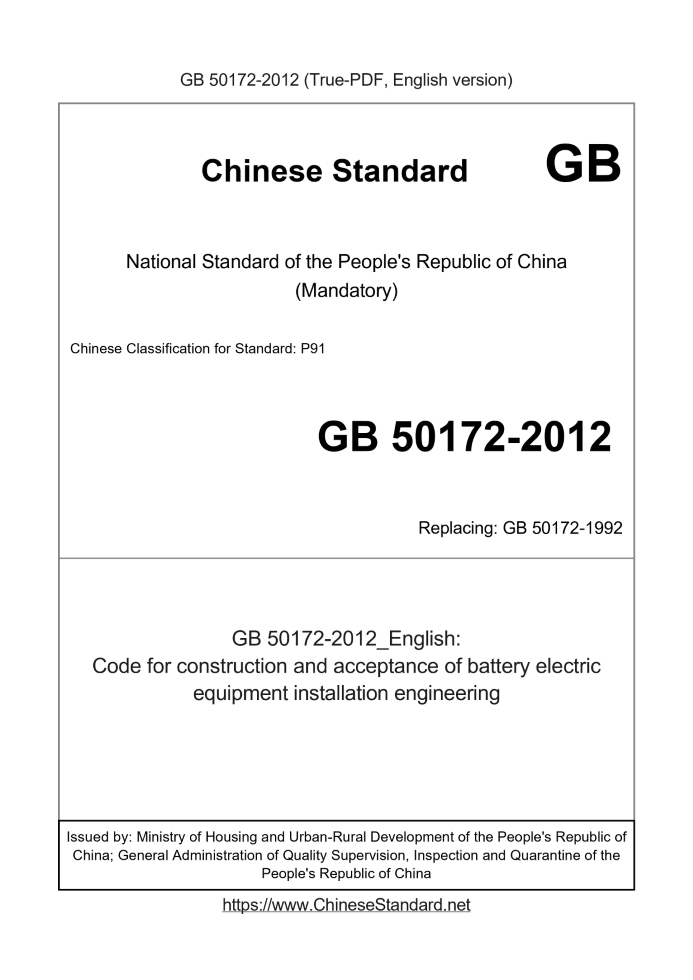 Basic dataStandard ID: GB 50172-2012 (GB50172-2012)Description (Translated English): Code for construction and acceptance of battery electric equipment installation engineering Sector / Industry: National Standard Classification of Chinese Standard: P91 Classification of International Standard: 29.020 Word Count Estimation: 40,436 Older Standard (superseded by this standard): GB 50172-1992 Quoted Standard: GB 50168; GB 50171; GB 50300; DL/T 459 Regulation (derived from): Bulletin of the Ministry of Housing and Urban No. 1418 Issuing agency(ies): Ministry of Housing and Urban-Rural Development of the People's Republic of China; General Administration of Quality Supervision, Inspection and Quarantine of the People's Republic of China Summary: This Chinese standard applies to the voltage of 12V and above, the capacity of 25A �� h and above VRLA batteries and capacity of 10A �� h and above, nickel-cadmium alkaline battery installation works construction and quality acceptance. Tips & Frequently Asked Questions:Question 1: How long will the true-PDF of GB 50172-2012_English be delivered?Answer: Upon your order, we will start to translate GB 50172-2012_English as soon as possible, and keep you informed of the progress. The lead time is typically 4 ~ 7 working days. The lengthier the document the longer the lead time.Question 2: Can I share the purchased PDF of GB 50172-2012_English with my colleagues?Answer: Yes. The purchased PDF of GB 50172-2012_English will be deemed to be sold to your employer/organization who actually pays for it, including your colleagues and your employer's intranet.Question 3: Does the price include tax/VAT?Answer: Yes. Our tax invoice, downloaded/delivered in 9 seconds, includes all tax/VAT and complies with 100+ countries' tax regulations (tax exempted in 100+ countries) -- See Avoidance of Double Taxation Agreements (DTAs): List of DTAs signed between Singapore and 100+ countriesQuestion 4: Do you accept my currency other than USD?Answer: Yes. If you need your currency to be printed on the invoice, please write an email to Sales@ChineseStandard.net. In 2 working-hours, we will create a special link for you to pay in any currencies. Otherwise, follow the normal steps: Add to Cart -- Checkout -- Select your currency to pay.Question 5: Should I purchase the latest version GB 50172-2012?Answer: Yes. Unless special scenarios such as technical constraints or academic study, you should always prioritize to purchase the latest version GB 50172-2012 even if the enforcement date is in future. Complying with the latest version means that, by default, it also complies with all the earlier versions, technically. |
